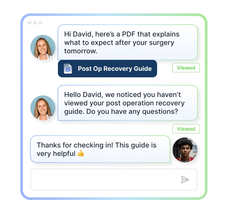 Text patients digital resources like videos, PDFs, and photos that improve adherence more effectively than paper instructions and allow for complete remote monitoring.